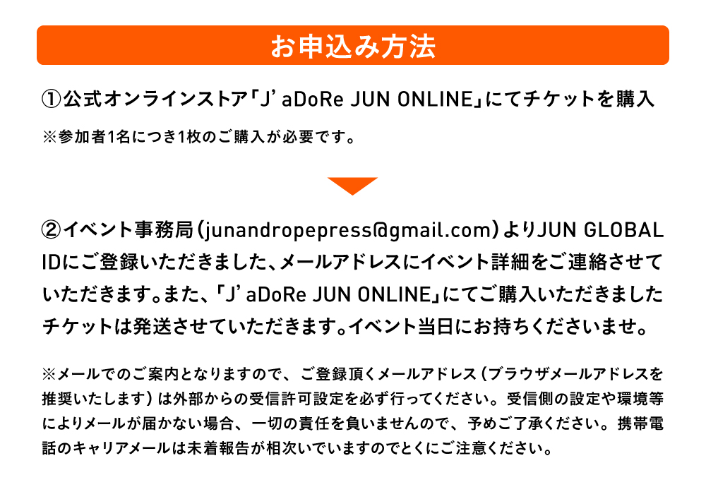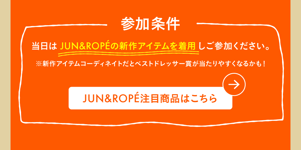 | ドレスコード | JUN&ROPÉの新作アイテムをご着用ください。 |
